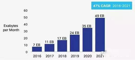 業界廣泛認為,5G移動通信直到2020或2021年才會提供,甚至即便到那時也不會廣泛提供。但是,隨著移動數據流量持續增長(過去5年翻了18倍),可以預計5G將比以往更快地到來。思科(Cisco)預測,到2021年,5G連接將比一般的4G連接產生多4.7倍的流量。下圖顯示了這種增長。