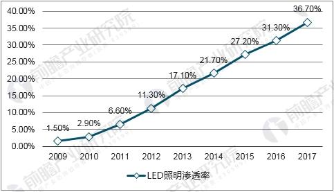 近年來,全球LED商場高速增加,已逐漸代替白熾燈、熒光燈等其他照明光源,滲透率繼續快速進步,據相關數據閃現,2017年全球LED滲透率抵達36.7%,較2016年上升5.40%。
